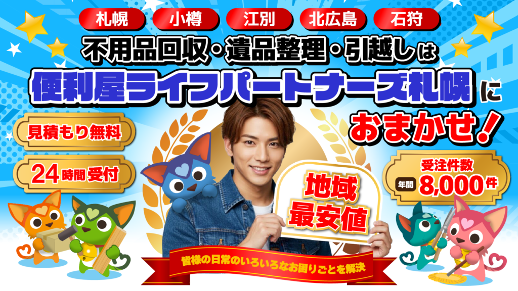 「自分一人では対応できない」「いらない物の数が多すぎる」「忙しくて家の雑用に手が回らない」など、日常生活の色々な問題に二の足を踏んでいませんか?お電話一本いただければ、優秀なスタッフが札幌市内・小樽・千歳をはじめ道内各地に赴き、安心価格でていねいにお片付け、荷物運搬などの依頼を引き受けます。「こんなにスムーズに片付くなんて!」「長年の問題がスッキリした!」と喜ばれるお客様の声が、私たちのやりがいです。今日も道内の街々を駆け巡り、皆様のお困りごとを解決していきます!