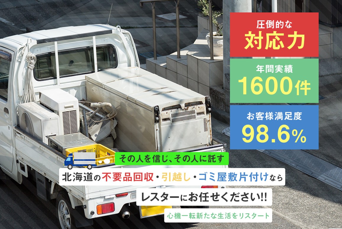レスターは、札幌市を中心に不用品回収や片付け、清掃作業などに対応しているサービスです。便利屋専業というよりは、不用品整理や片付け、引越し前後の整理など回収・清掃寄りの依頼に強い点が特徴です。公式サイトでも、北海道・札幌での不用品回収、引っ越し、ゴミ屋敷片付けなどを案内しています。