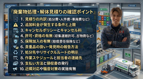 事業者が一般廃棄物収集運搬許可、産廃処理に関する委託契約、古物商許可、労災保険や賠償責任保険に加入しているかを確認しましょう。契約書には作業範囲、料金内訳、追加料金発生条件、買取品目と査定額、損害時の補償や再発防止手順が明記されていることが望ましいです。これらが整っている業者はトラブル時の対応力が高く、安心して任せられます。
