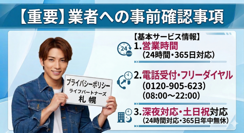 女性スタッフ対応や深夜対応を希望する場合は、事前に明確に確認して対応可否と追加料金を把握しておくと安心です。