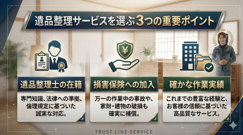 遺品整理士の資格を持つスタッフがいるか、損害保険に加入しているかは安心して依頼するための重要な基準です。