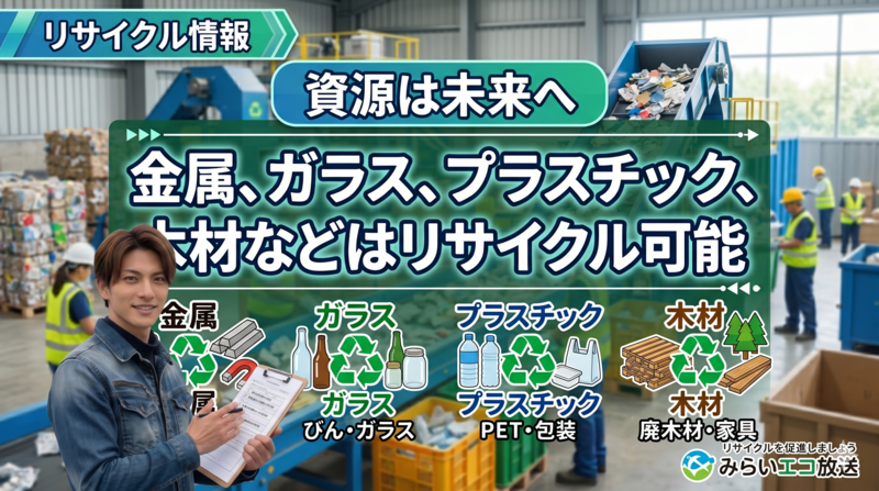 金属、ガラス、プラスチック、木材などはリサイクル可能な場合が多く、自治体や民間の回収サービスを活用できます。