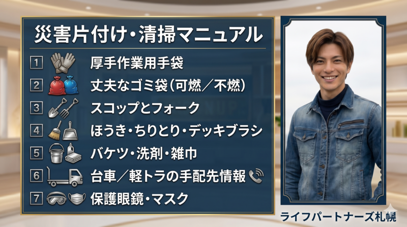 必須の道具は厚手作業用手袋、中程度のゴミ袋、丈夫なスコップ、ほうきとちりとり、デッキブラシ、バケツ、雑巾、洗剤、そして折りたたみ可能な台車や軽トラ手配の手配先連絡先です。
